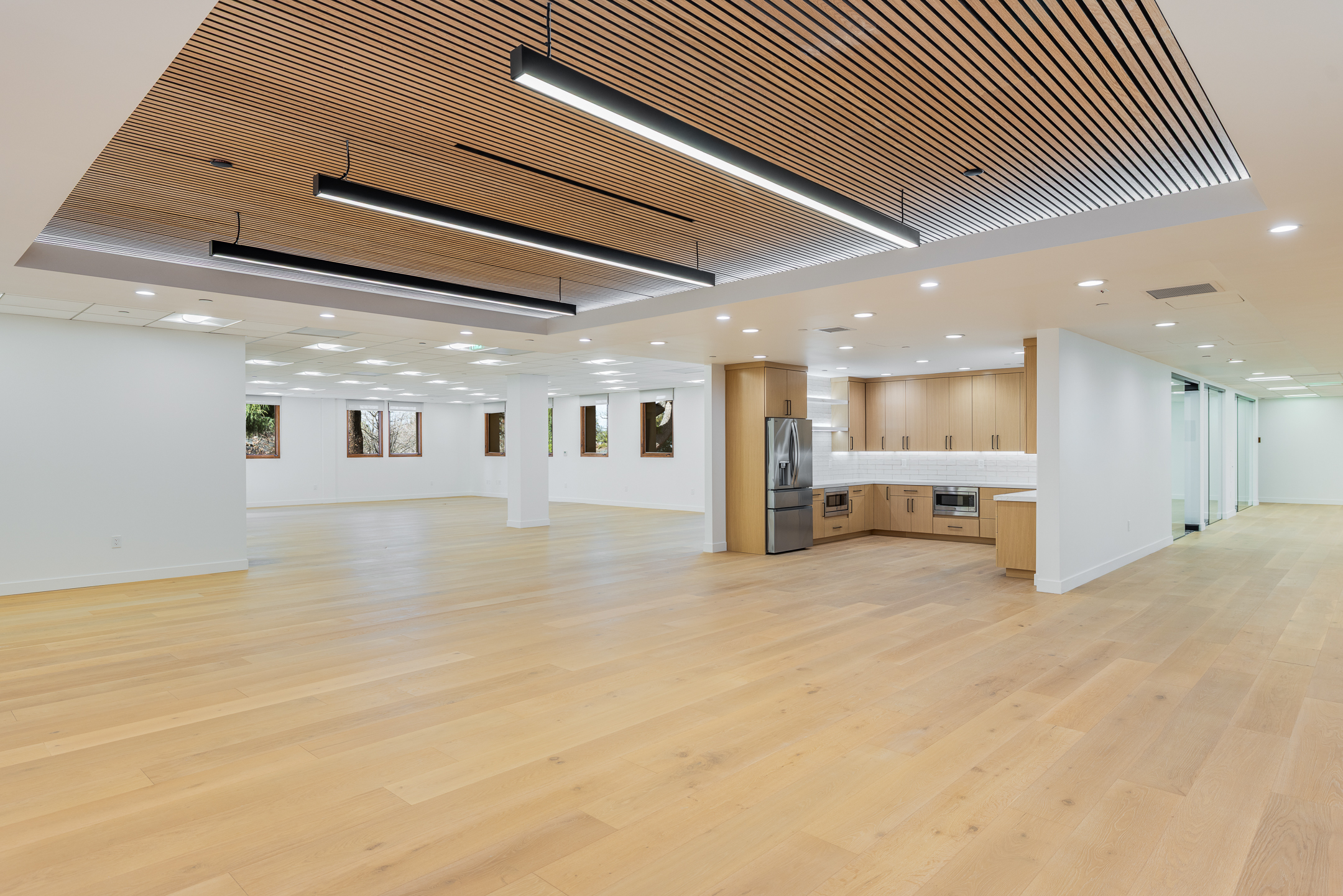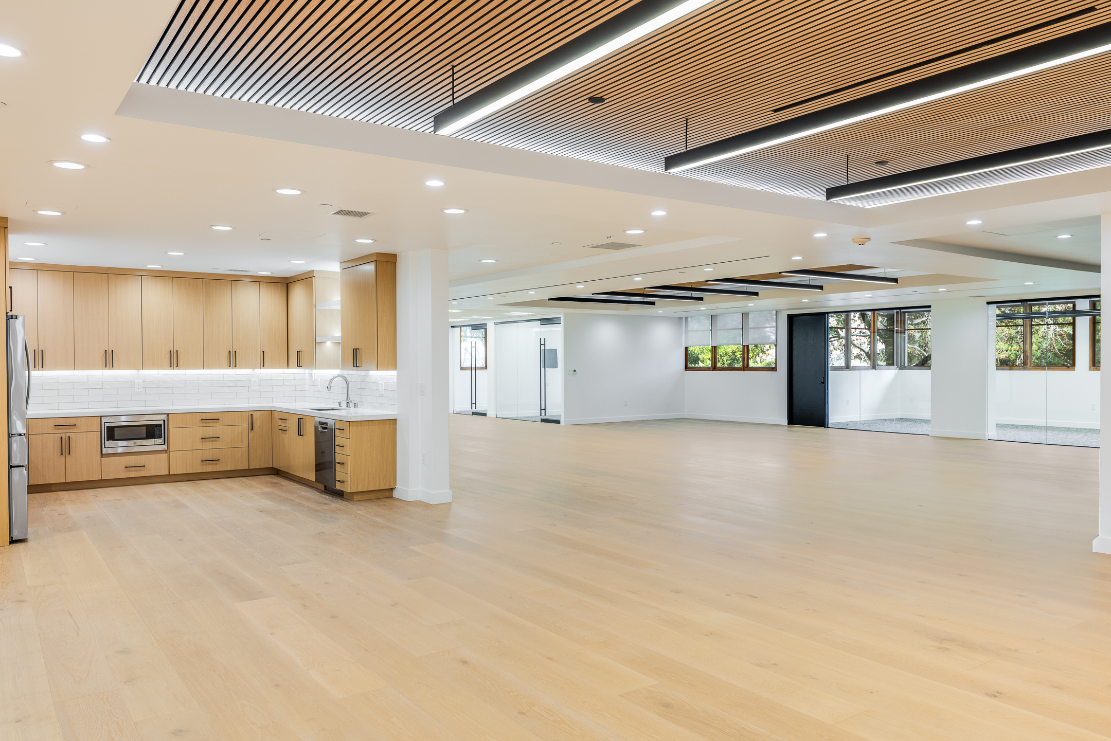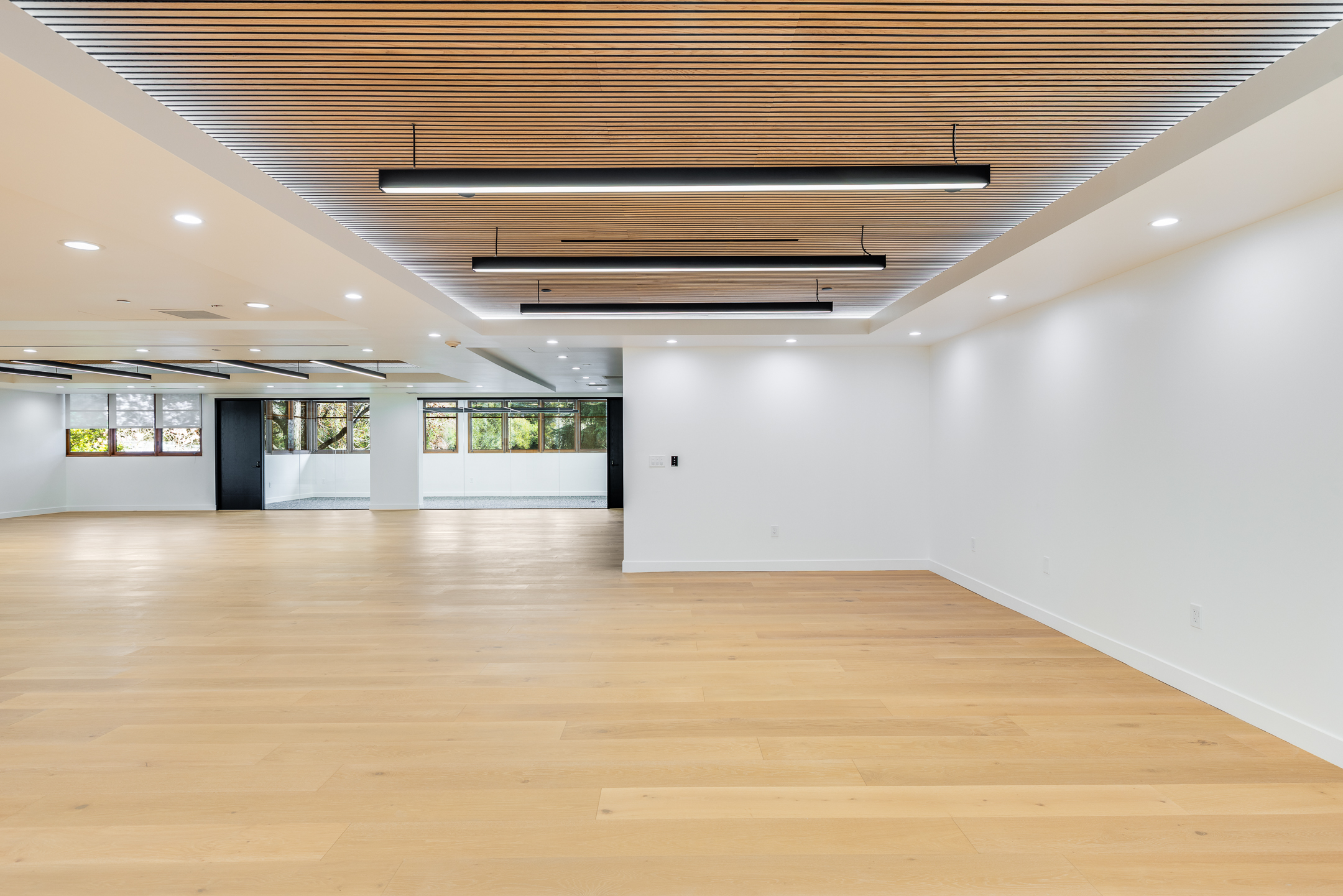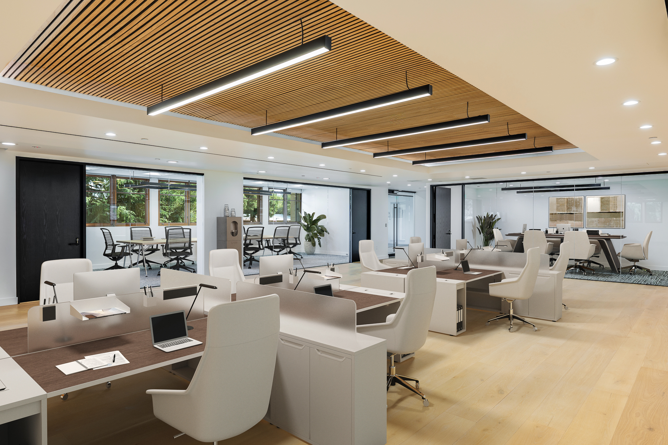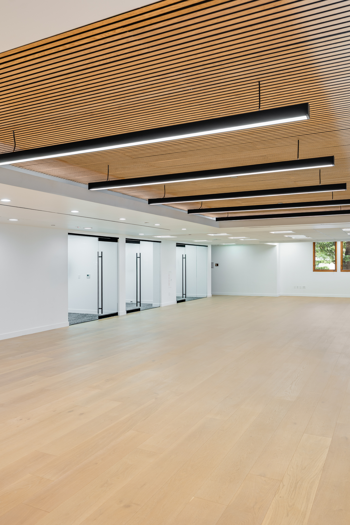 The project scope includes complete remodel of the interior suites to create an open workspace, flexible office layouts, conference rooms, collab areas. New paint, lighting & carpet, wood flooring throughout. New glass front offices with glass doors & break area cabinets, countertops. Open wood slat ceiling with linear lights and soffits around.