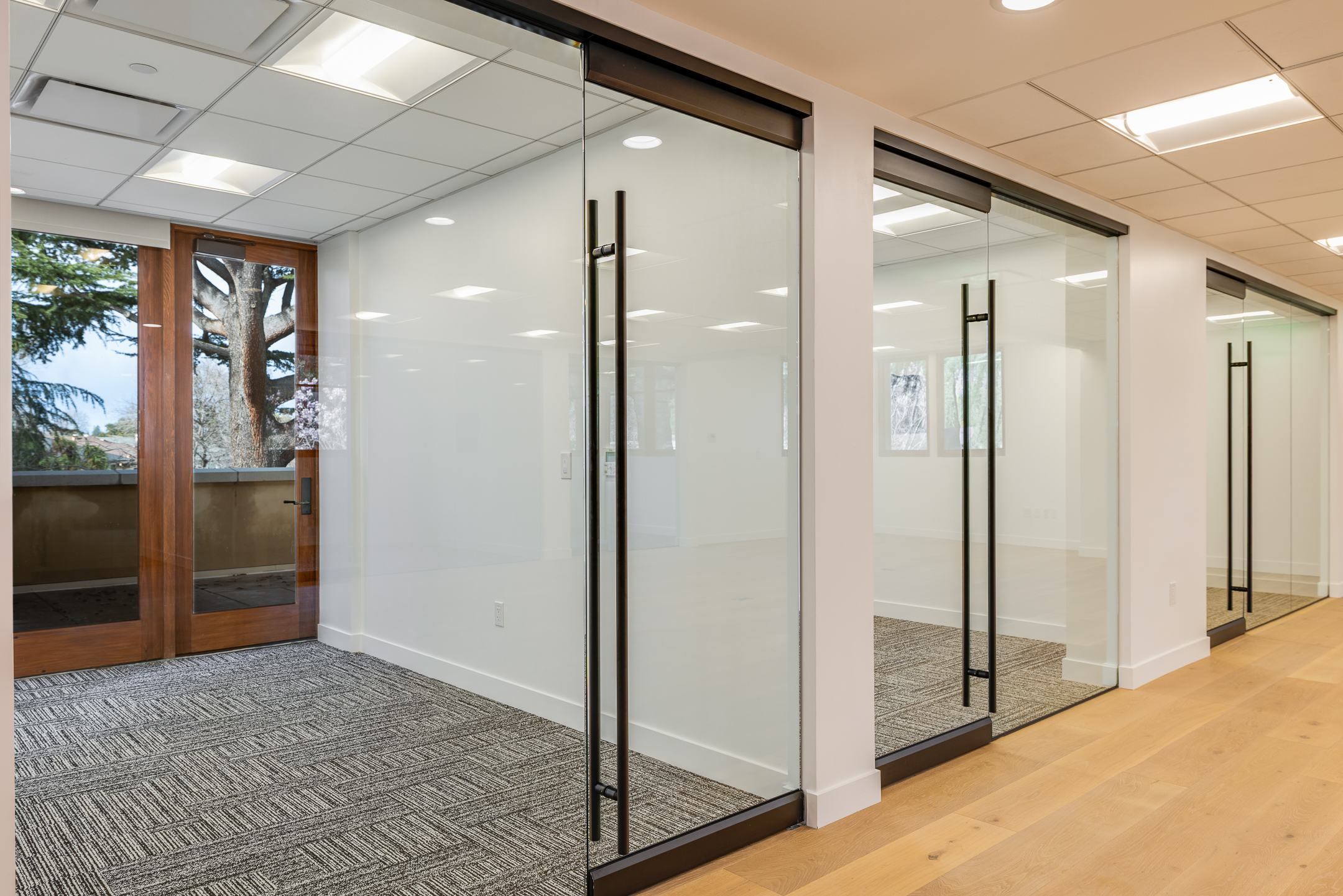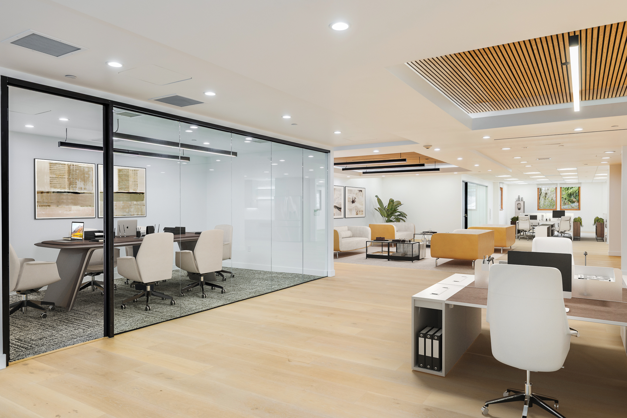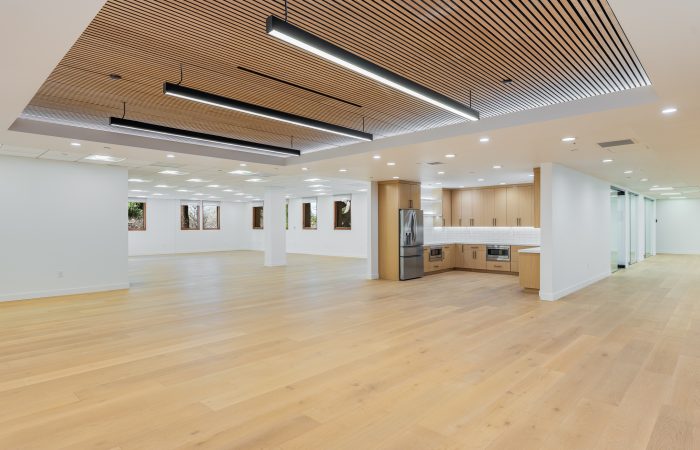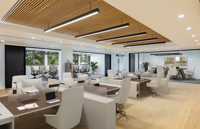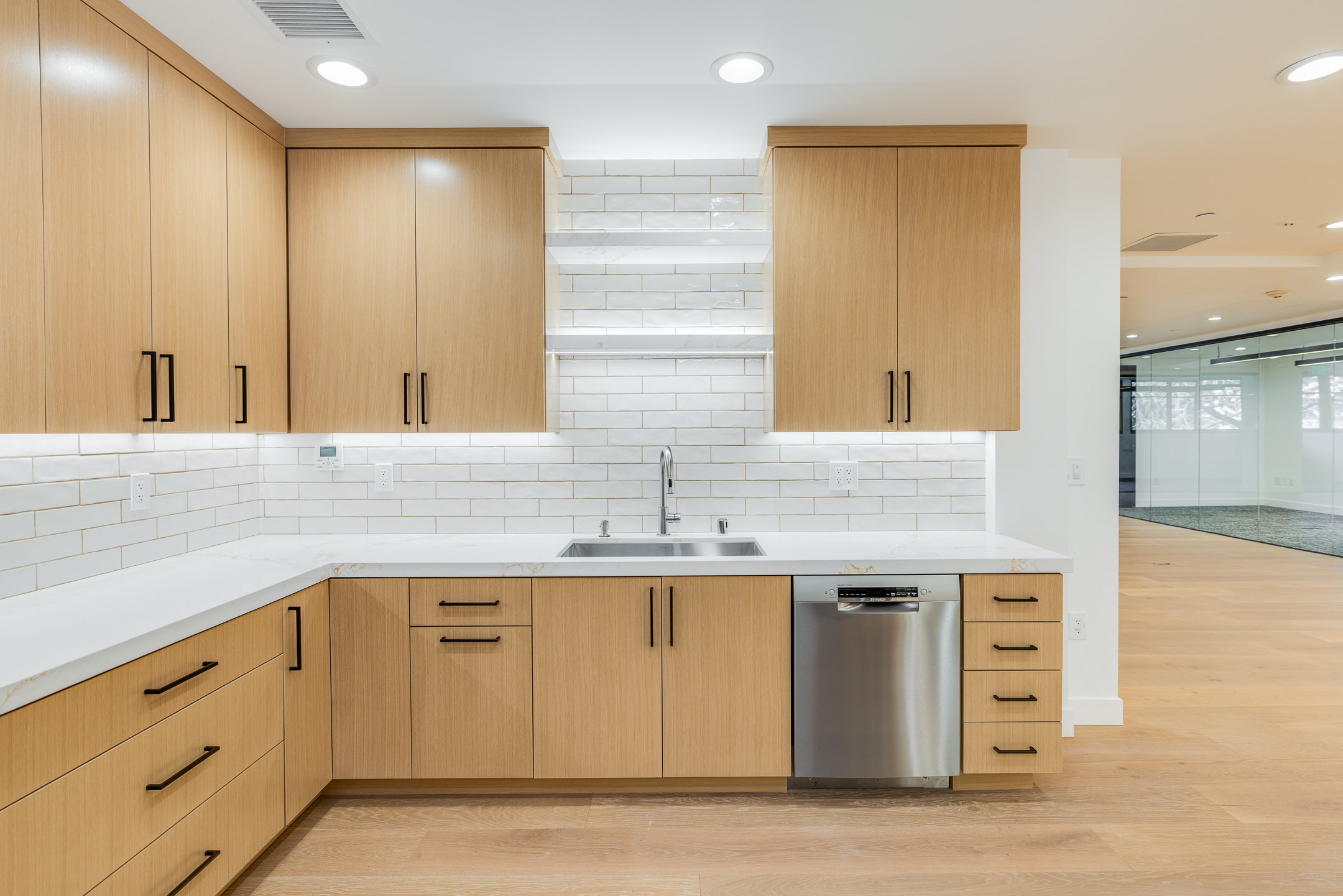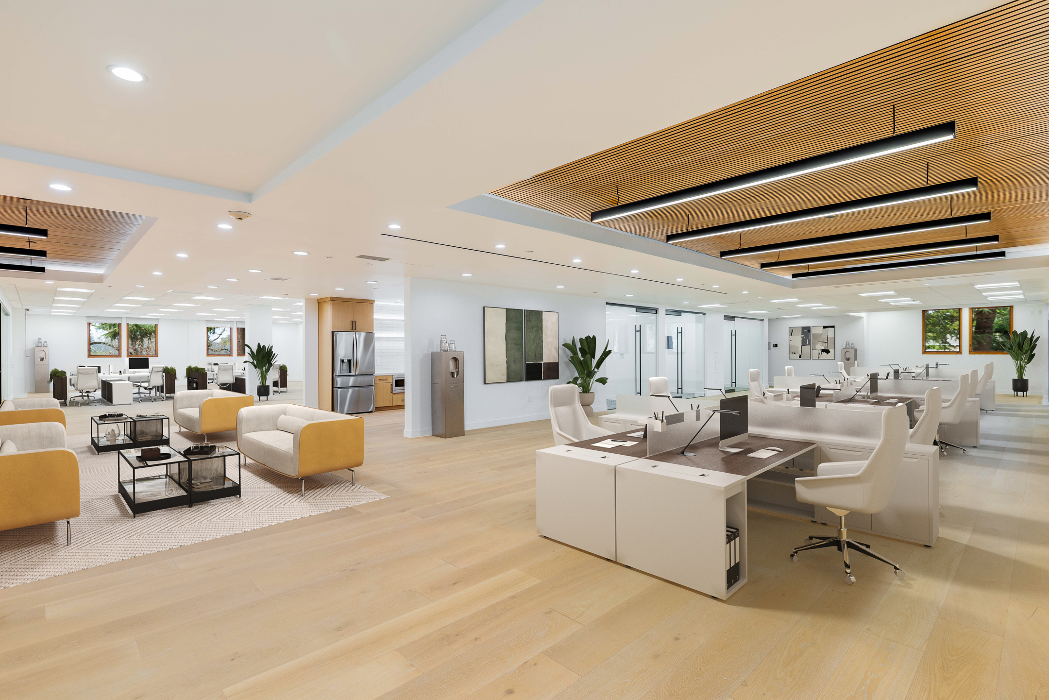 The project scope includes complete remodel of the interior suites to create an open workspace, flexible office layouts, conference rooms, collab areas. New paint, lighting & carpet, wood flooring throughout. New glass front offices with glass doors & break area cabinets, countertops. Open wood slat ceiling with linear lights and soffits around.