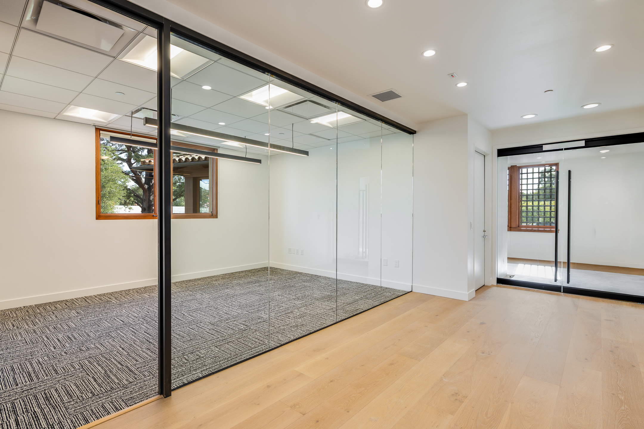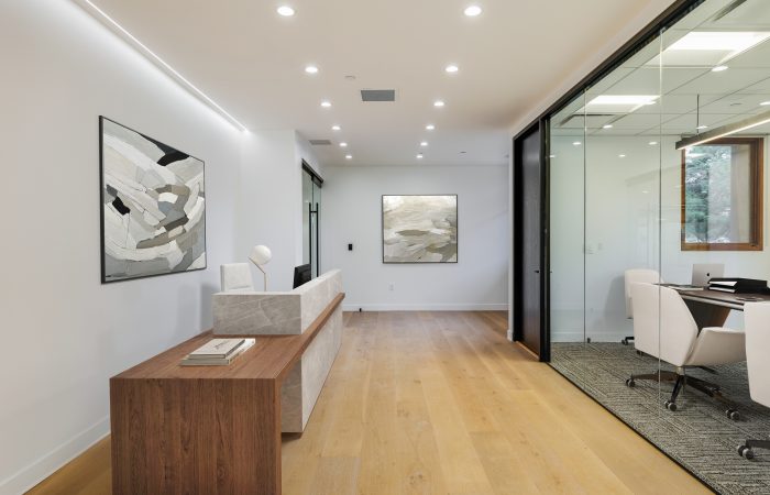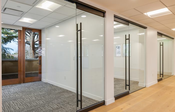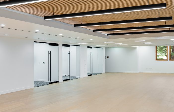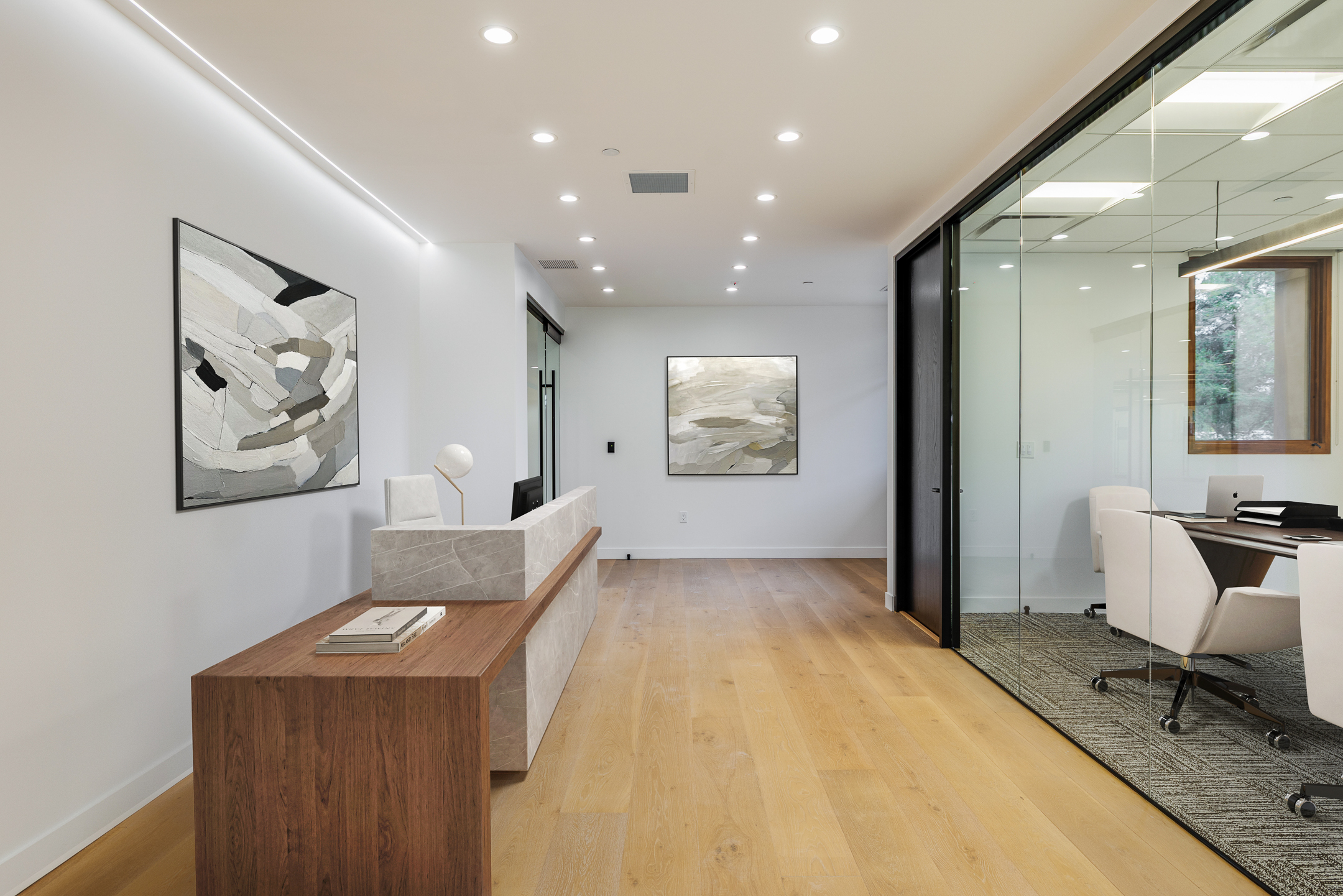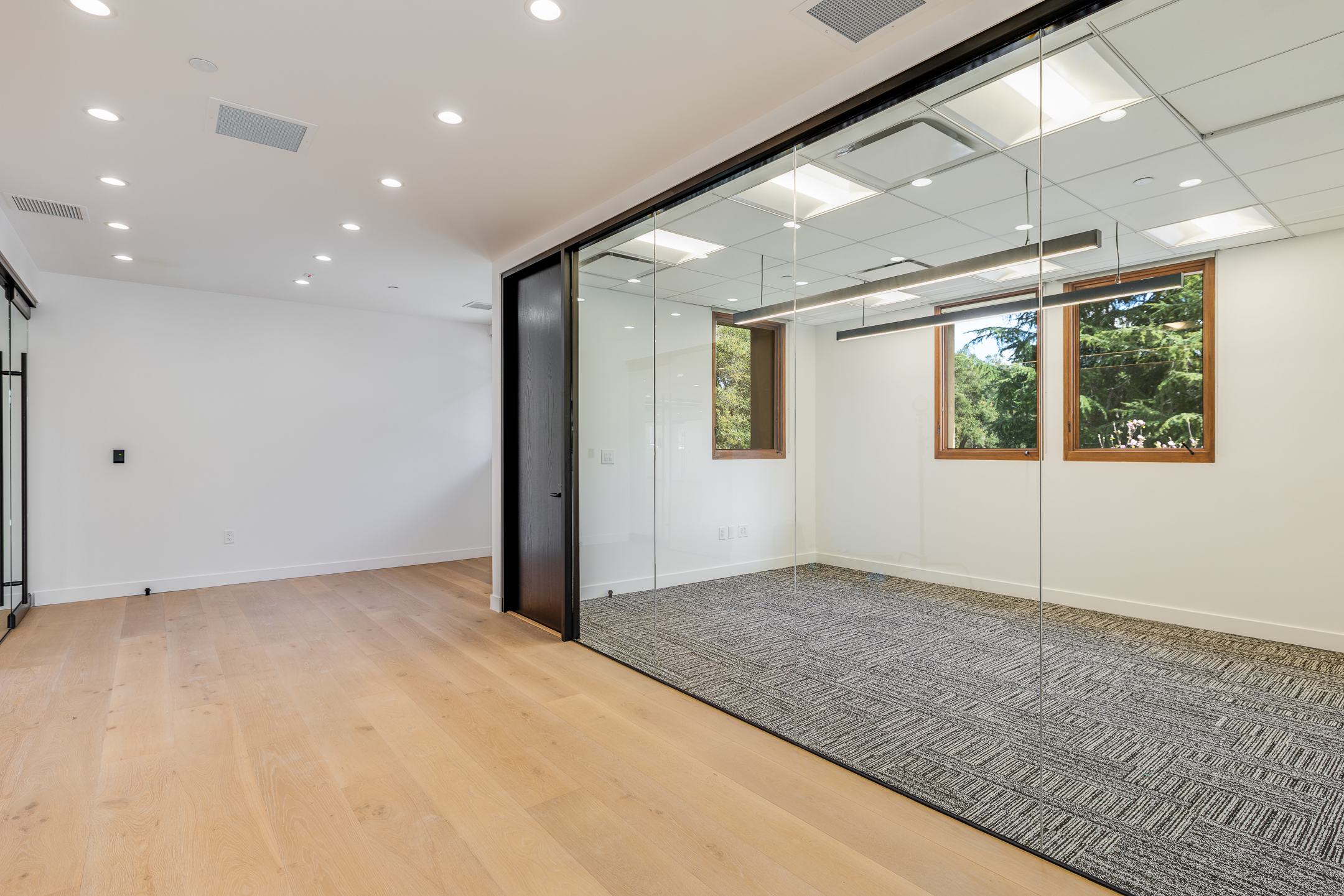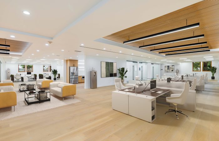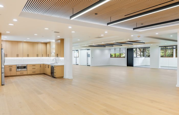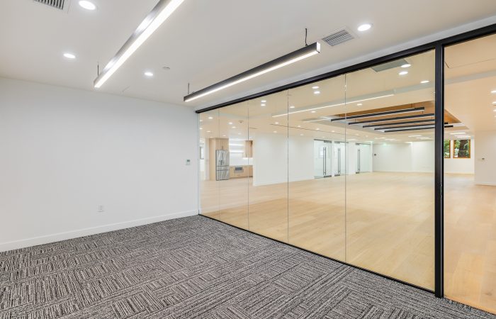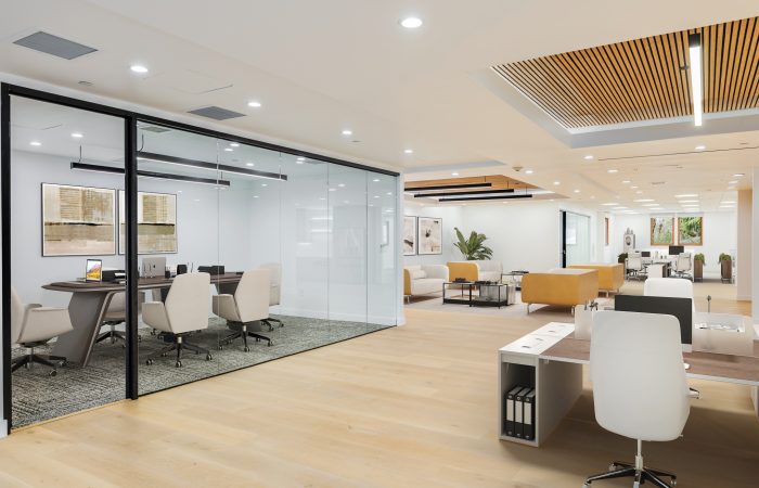 The project scope includes complete remodel of the interior suites to create an open workspace, flexible office layouts, conference rooms, collab areas. New paint, lighting & carpet, wood flooring throughout. New glass front offices with glass doors & break area cabinets, countertops. Open wood slat ceiling with linear lights and soffits around.