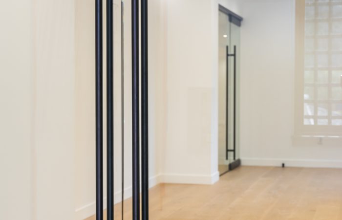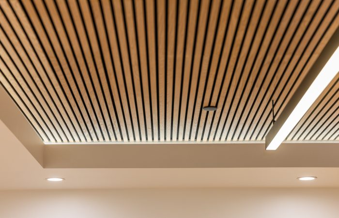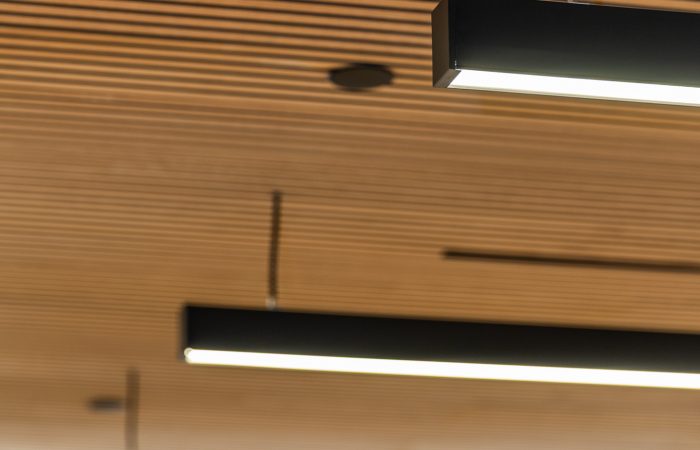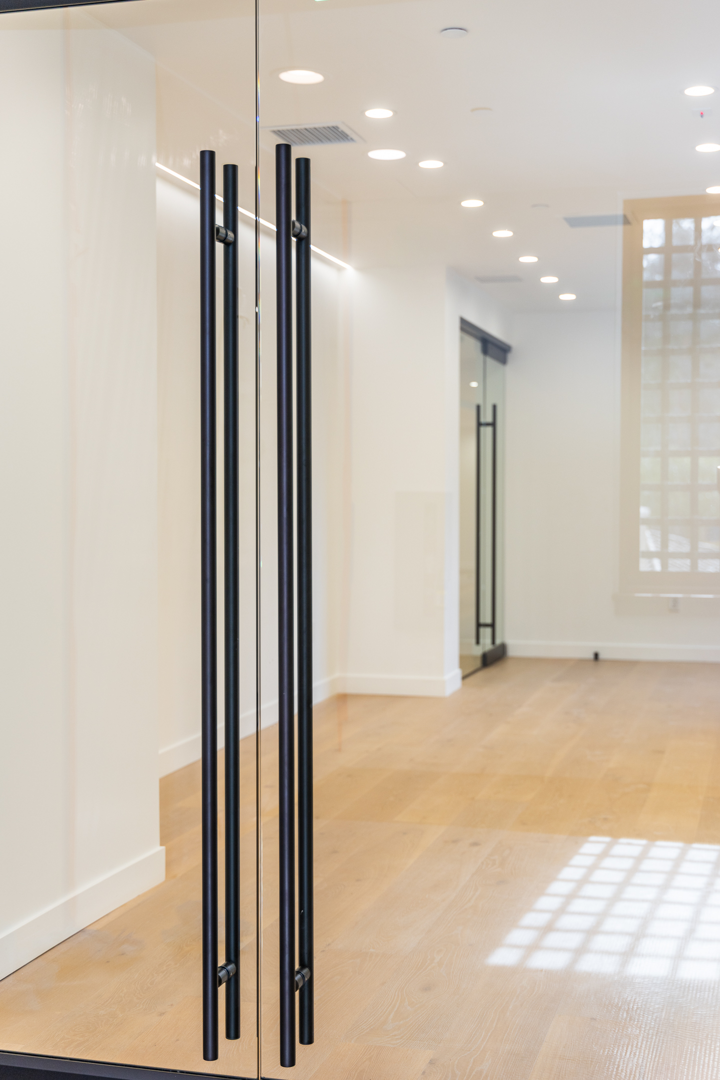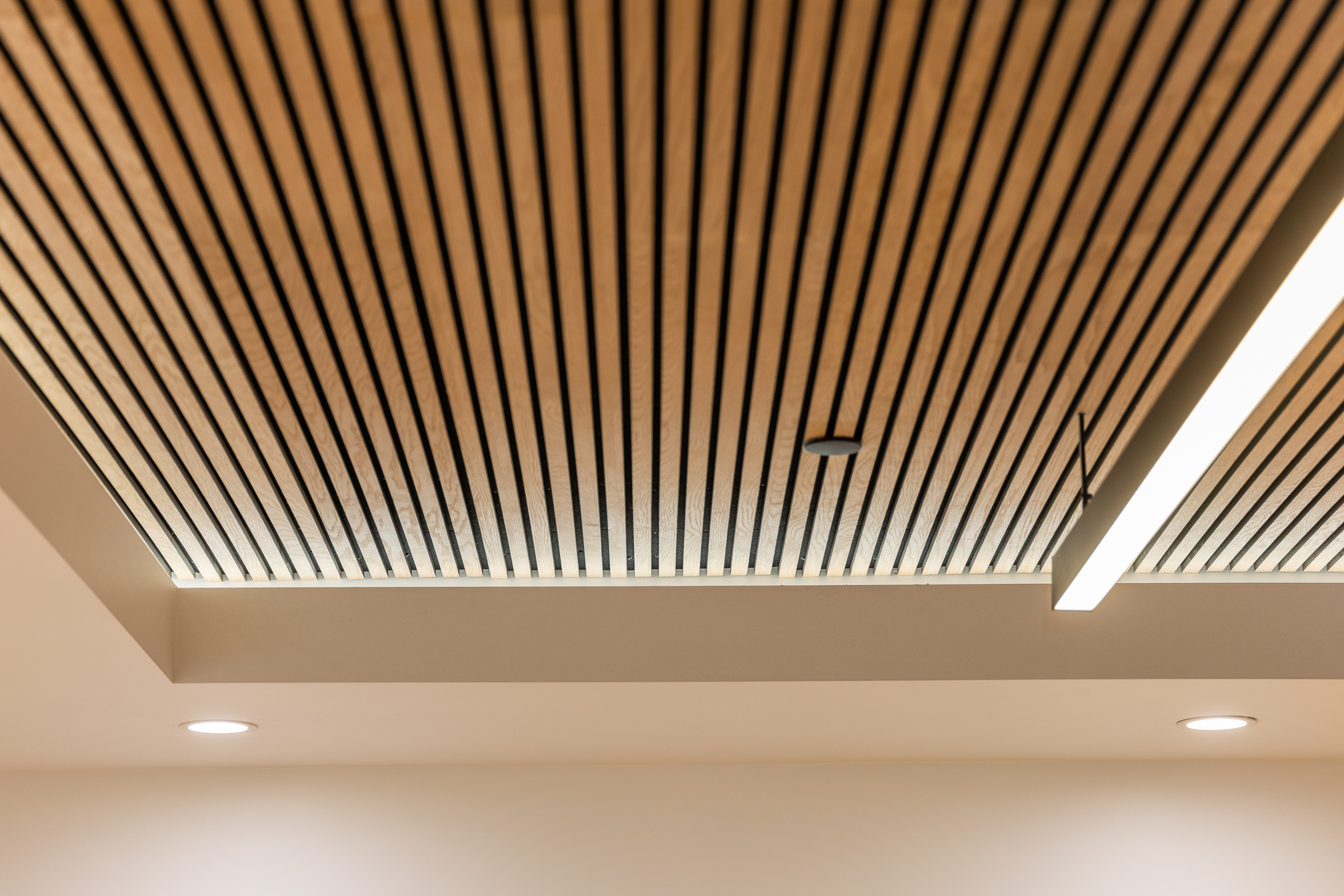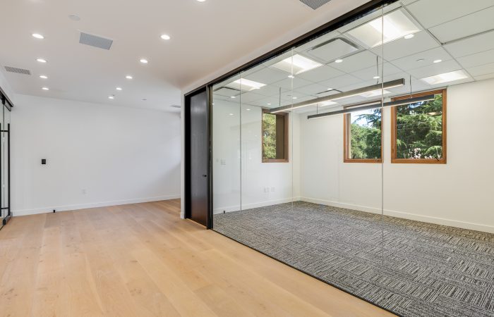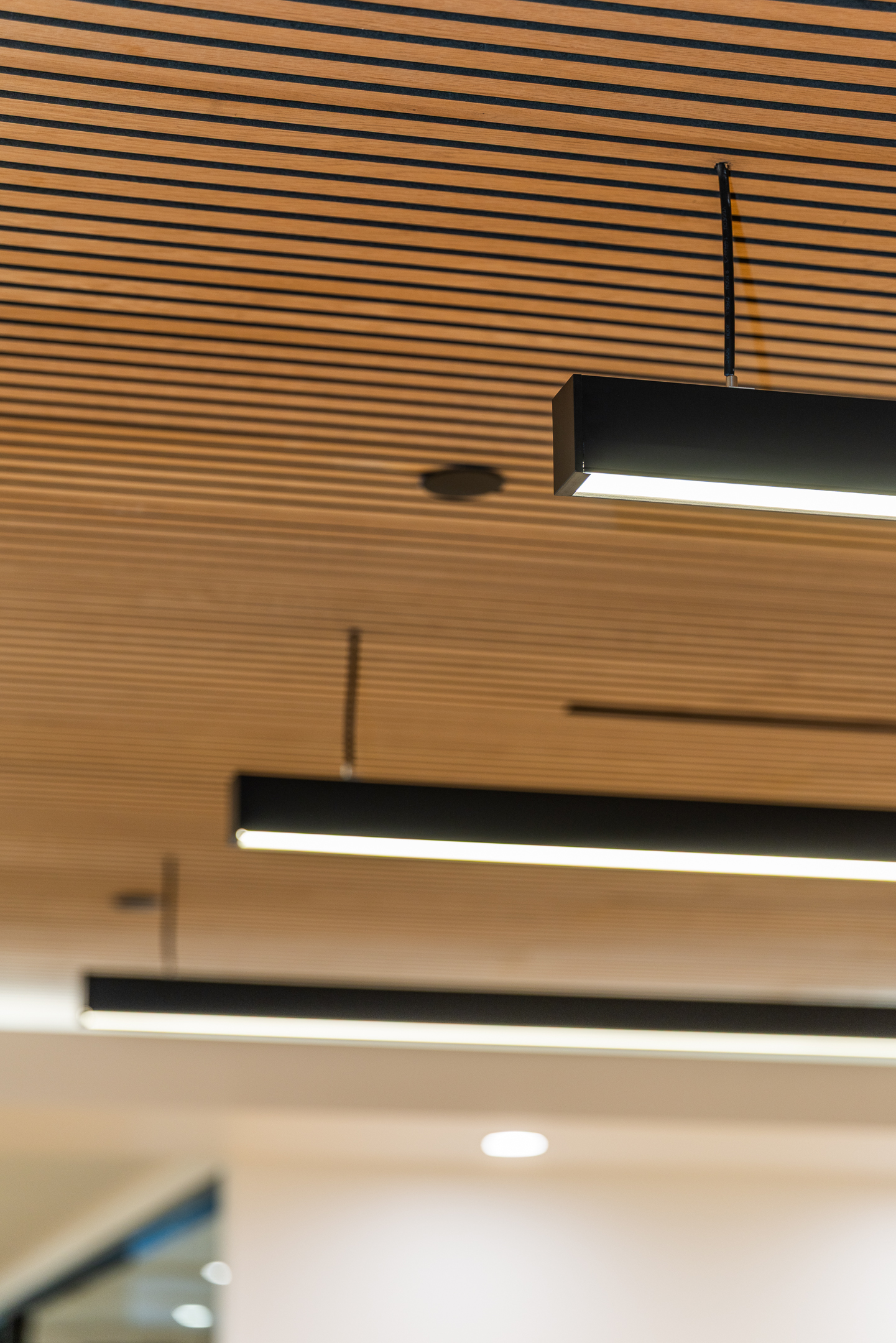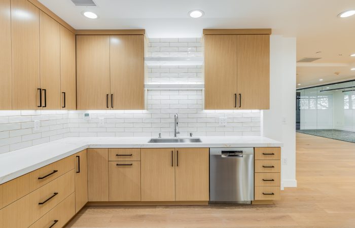 The project scope includes complete remodel of the interior suites to create an open workspace, flexible office layouts, conference rooms, collab areas. New paint, lighting & carpet, wood flooring throughout. New glass front offices with glass doors & break area cabinets, countertops. Open wood slat ceiling with linear lights and soffits around.